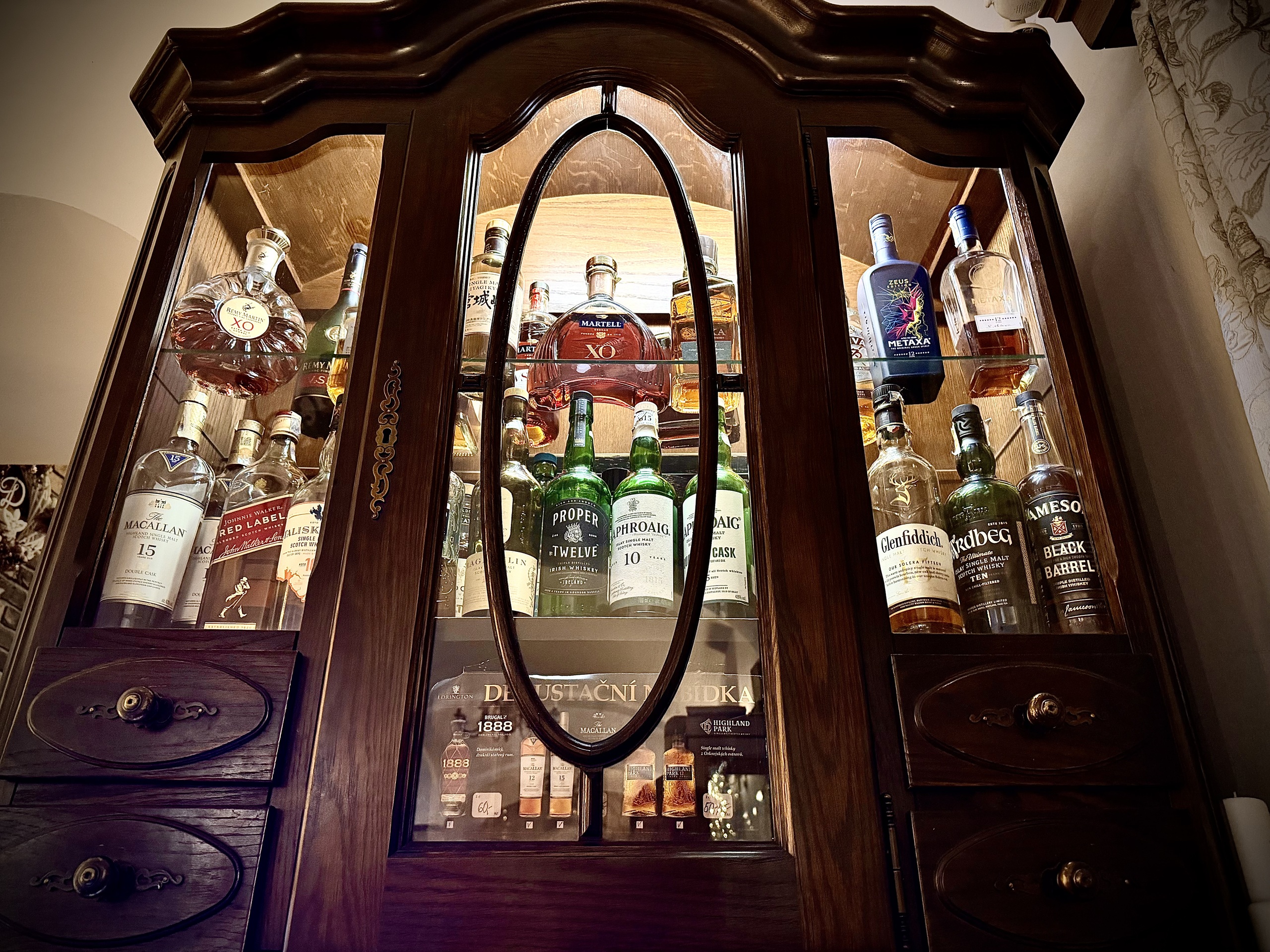 Naší nabídku rumů, whisky a cognacu si můžete prohlédnout přímo ve vitrínách v restauraci.