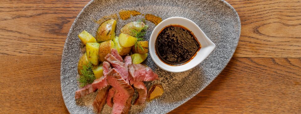 200g, s omáčkou Demi-Glace se zeleným pepřem, glazované cibulky a domácí bramborové krokety
