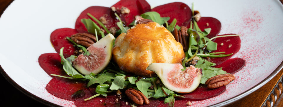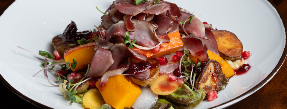 variace listových salátů. brusinkový vinegret, dýně Hokkaido sous-vide, grenaille, granátové jablko