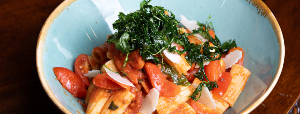 cherry rajčata, česnek, rukolové chipsy, hobliny parmazánu